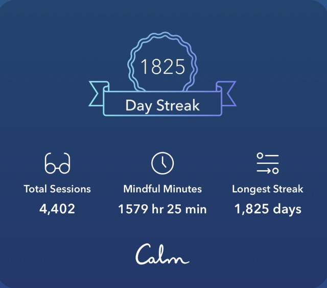 As many of you following along may know, I'm currently in the middle of a daily meditation streak, via the Calm app. 365 days x 5 = 1825... hence the five-year benchmark, which I just hit on Friday, July 11th. I've written extensively about key aspects of this journey thus far, and continue to feel like maintaining such a streak is worth the effort and attention... even though some days it feels more like I'm sitting through a quick meditation solely to maintain the streak! After all, the journey to mastery of anything, in my experience, is always about consistently showing up, whether you feel like it or not, or whether a particular session is fruitful or not. Some days they won't be, I can promise you that. This applies to practicing drums, lifting weights, running, and especially writing. But we keep our heads down and continue, long after many around us have stopped. Why? Because it's one of the only ways to evolve large... to truly become better versions of ourselves. Just shut the fuck up and do the work. Relentlessly. Endlessly.