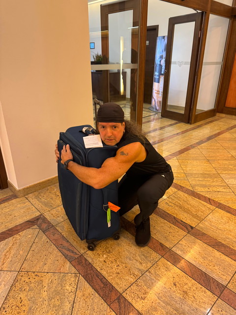 Once we hit Vienna, I met up with the rest of the band and crew (nine total in our party) to collect our luggage and make the 3 to 4-hour drive to a remote part of the Czech Republic. However... my bag didn't make it. Yes, friends... my big-ass bag, with multiple changes of clothes for workouts and runs, stage gear, practice pad and sticks, all kinds of vegan food, a blender, Dragon Dirt smoothie mix... essentially, my whole world, as it were... MIA. I mean, this heavy, road-worn piece of luggage is such a staple in the Lita Ford tour lexicon, "he" has his own name: Big Blue. And once the conveyor belt stopped and Jarod was able to confirm the bag was lost, I checked my Apple Air Tag app to see that, sure enough, Big Blue was still in fucking Washington DC! Good God.
