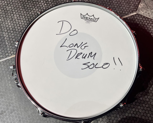 During the set, in the middle of "Can't Catch Me"—just before my drum solo—I saw my tech, Chip, heading toward me with a snare drum in his hands. Did I break mine and not know it? Nope. He simply held up the drum and delivered a message for me: